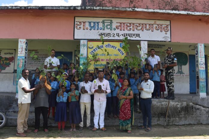 बगहा प. चंपारण, 65 वाहिनी सशस्त्र सीमा बल, बेतिया (बिहार) द्वारा राजकीय प्राथमिक विद्यालय नारायणगढ़, बगहा में विद्यार्थियों के बीच वृक्षारोपण एवं नशामुक्त भारत जागरूकता कार्यक्रम का आयोजन किया गया। यह कार्यक्रम कमांडेंट श्री नंदन सिंह मेहरा के कुशल मार्गदर्शन में संपन्न हुआ।