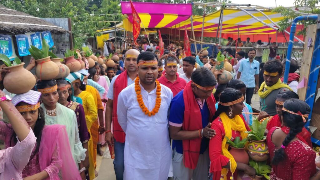 शारदीय नवरात्र के निमित्त रविवार को ब्रह्म स्थान वार्ड नंबर 13 नया बाजार शेख मझरिया पंचायत में बाजे गाजे और जयकारों के बीच भव्य कलश यात्रा निकाली गई। जिसमें कचहरी टोला वार्ड नंबर 5 और 6 होते हुए बलुआहा घाट पर जाकर 1051 कुंवारी कन्याओं ने कलश भरकर पूजा स्थल पर लाया। इस दौरान माता की जयकारों से वातावरण गुंजित होता रहा तथा भक्ति धुनो पर श्रद्धालु थिरकते रहे बताते चले की नवयुवक संघ दुर्गा पूजा समिति शेख मझरिया द्वारा पिछले 18 वर्षों से लगातार माता दुर्गा की पूजा आयोजित किया जाता चला आ रहा है।