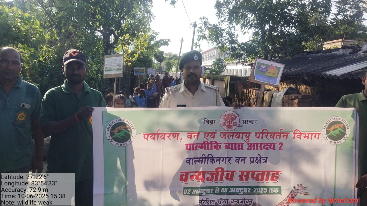वाल्मीकि नगर थाना क्षेत्र के वन प्रमंडल 2 के भेरियारी वन कर्मियों ने वन्य प्राणी सप्ताह के तहत भेरियारी स्थित राजकीय उत्क्रमित मध्यविद्यालय थारू टोला के बच्चो सँग प्रभातफरी निकाला । इस मौक़े पर बच्चो ने तख्तीयों मे वन्य प्राणी संरक्षण के स्लोगन लिखें तख्त लेकर लोगो को जागरूक किया। गाँव गाँव की गलियों मे प्रभातफरी घूम घूम कर बच्चे व वन कर्मियों ने जागरूकता भरे नारे लगाते रहे। इस अवसर पर प्रधानाध्यापक शिक्षक,शिक्षिका, वनपाल सूरज राम, वनरक्षी पिंटू,कुमार पाल,रंजन कुमार, राकेश कुमार समेत कई ग्रामीण शामिल रहे।