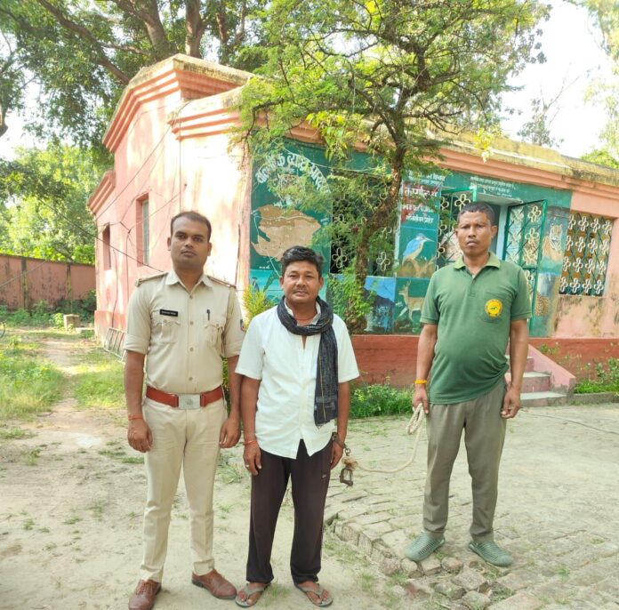 वाल्मीकि नगर थाना क्षेत्र के वन प्रमंडल 2 के टी/31 जंगल मे पेड़ो के पातन करते एक वन अभियुक्त को वन गश्ती टीम द्वारा धर दबोचा गया है। रेंजर राजकुमार पासवान ने बताया की विशेष गश्ती अभियान के दौरान सुचना मिली की एक व्यक्ति वन सेक्टर टी/31 के जंगल मे पेड़ का पातन कर रहा हैं। सुचना मिलते ही गश्ती दल उक्त स्थल पर पहुंचकर घेराबंदी कर चम्पापुर गोनोली निवासी हरिलाल महतो को रंगे हाथ पकड़ लिया गया है। रेंजर राजकुमार पासवान ने आगे बताया की अभियुक्त वन कर्मियों को देखकर घटनास्थल से भागने लगा लेकिन सहयोगियों के सहयोग से उसे पकड़ लिया गया। गश्ती दल मे रेंजर राजकुमार पासवान समेत वनकर्मी प्रकाश यादव,अभय कुमार और अन्य वनकर्मी शामिल थे।