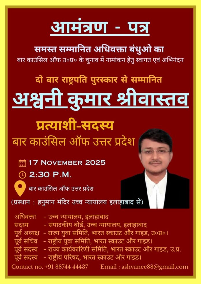 प्रयागराज।आज प्रयागराज में वह दृश्य देखने को मिला जिसने पूरे अधिवक्ता समाज का ध्यान अपनी ओर खींच लिया। अश्वनी कुमार श्रीवास्तव ने अपने भारी समर्थक समूह के साथ बार काउंसिल ऑफ़ उत्तर प्रदेश की सदस्यता के लिए धूमधाम से पर्चा दाखिल किया। उनके आगमन से परिसर का माहौल उत्साह, जोश और समर्थकों की तालियों से गूंज उठा।
