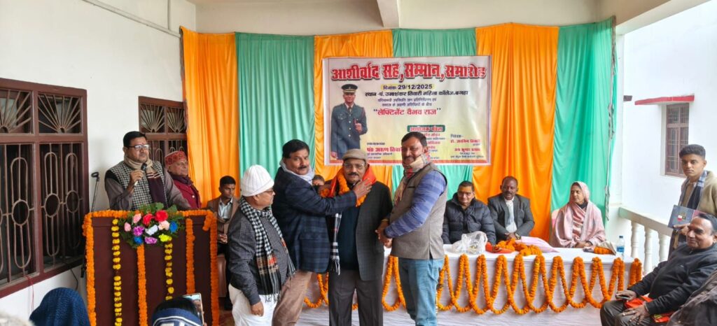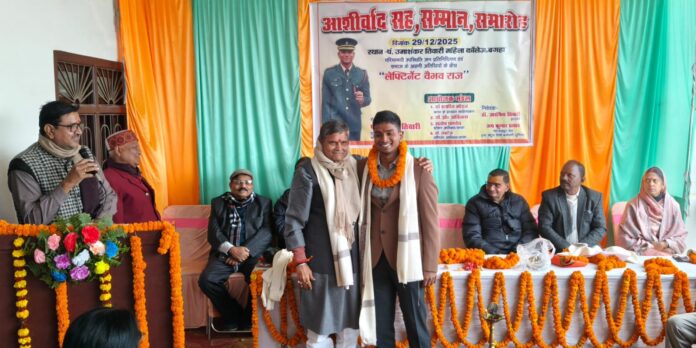 पंडित उमाशंकर महिला महाविद्यालय बगहा में सोमवार के दिन आशीर्वाद सह सम्मान समारोह का आयोजन हुआ। इस कार्यक्रम में बगहा के युवा वैभव कुमार को आर्मी के लेफ्टिनेंट पद हासिल होने पर बगहा के बुद्धिजीवियों ने लोगों ने वैभव को सम्मानित किया। कड़ी सफलता से हासिल की। बगहा के मिट्टी की उपज मिलिट्री स्कूल पुणे एवं आई.एम.ए. देहरादून से पास आउट लेफ्टिनेंट वैभव राज पुत्र प्राचार्य विजय कुमार बड़े पिता जयकुमार प्रसाद पूर्व स्टेशन अधीक्षक नेता ऑल इंडिया रेलवे मेंस फेडरेशन ईस्ट सेंट्रल रेलवे कर्मचारी यूनियन का आशीर्वाद सह सम्मान समारोह जनप्रतिनिधियों एवं समाज के अग्रणी लोगों को इस कार्यक्रम में फूलों के माला और अंग वस्त्र से सम्मानित किया गया।