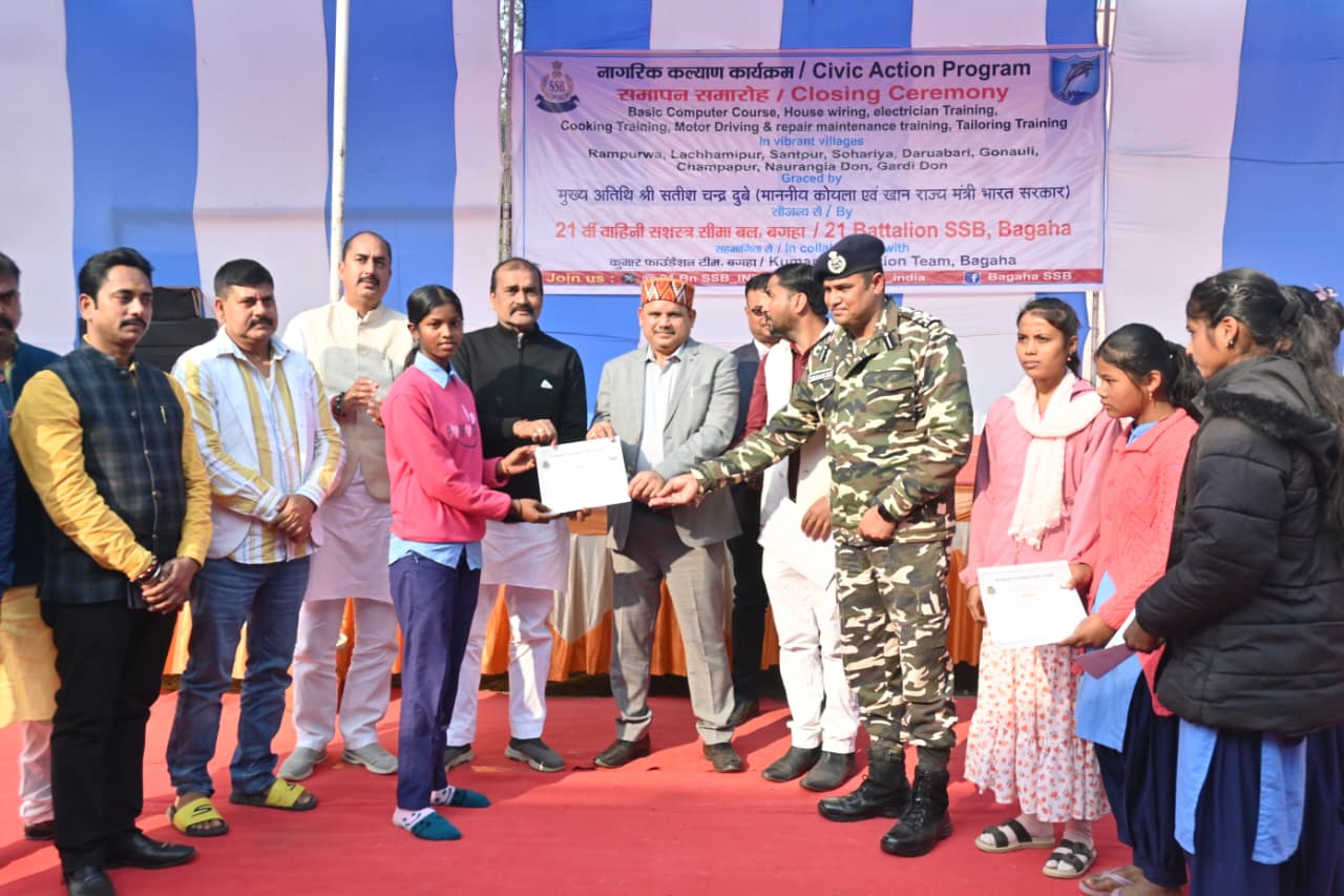 एसएसबी 21वीं वाहिनी बगहा द्वारा कमांडेंट तपेश्वर संबित राउत के दूरदर्शी नेतृत्व से नागरिक कल्याण कार्यक्रम के तहत सीमावर्ती क्षेत्र के बेरोजगार व ज़रूरतमंद युवाओं एवं युवतियों हेतु बेसिक कंप्यूटर प्रशिक्षण, हाउस वायरिंग इलेक्ट्रीशियन प्रशिक्षण, कुकिंग प्रशिक्षण, मोटर चालक प्रशिक्षण, सिलाई प्रशिक्षण कार्यक्रम का समापन के साथ साथ जनमानस एवम् पशुओं की चिकित्सा हेतु मानव चिकित्सा शिविर एवं पशु चिकित्सा शिविर का आयोजन नदी घाटी योजना विद्यालय पर किया गया l