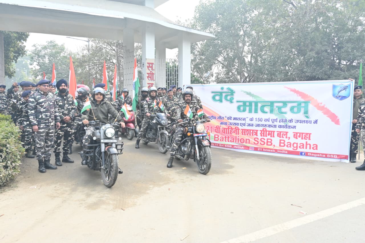 एसएसबी 21वीं वाहिनी बगहा द्वारा द्वितीय कमान अधिकारी सुरेश शर्मा कार्यवाहक कमांडेंट के दूरदर्शी नेतृत्व से वंदे मातरम् गीत के 150 साल पूर्ण होने पर 21 वाहिनी बगहा से बाइक रैली वाल्मीकि नगर तक आयोजित किया गया साथ नदी घाटी योजना उच्च विद्यालय के प्रांगण में सांस्कृतिक एवं खेलकूद कार्यक्रम का आयोजन किया गया l