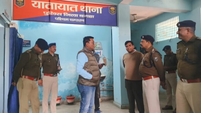 बगहा पुलिस जिला के पुलिस अधीक्षक रामानंद कौशल ने रविवार को कई थानों का औचक निरीक्षण किया। जिसमें बगहा यातायात थाना, महिला, एससी एसटी थाना, साइबर एवं पटखौली थाना का निरीक्षण किया। पुलिस अधीक्षक रामानंद कौशल ने इन सभी थानो का रनिंग रजिस्टर एवं ओडी पंजी, मालखाना का रख-रखाव, लंबित कांडों का त्वरित निष्पादन तथा विधि-व्यवस्था संधारण हेतु उपस्थित थानाध्यक्ष महिला, एससी एसटी , यातायात, साईबर एवं पटखौली थाना तथा अन्य पुलिस पदाधिकारियों/कर्मियों को आवश्यक दिशा-निर्देश दिया गया। एसपी ने थानों में लंबित मामलों को लेकर थाना प्रभारी को सख्त निर्देश दिया कि लंबित मामलों की जांच कर जल्द से जल्द निष्पादन करें और कार्यालय में इसकी सूचना दें। इस दौरान अनुमंडल पुलिस पदाधिकारी कुमार देवेंद्र भी मौजूद थे।