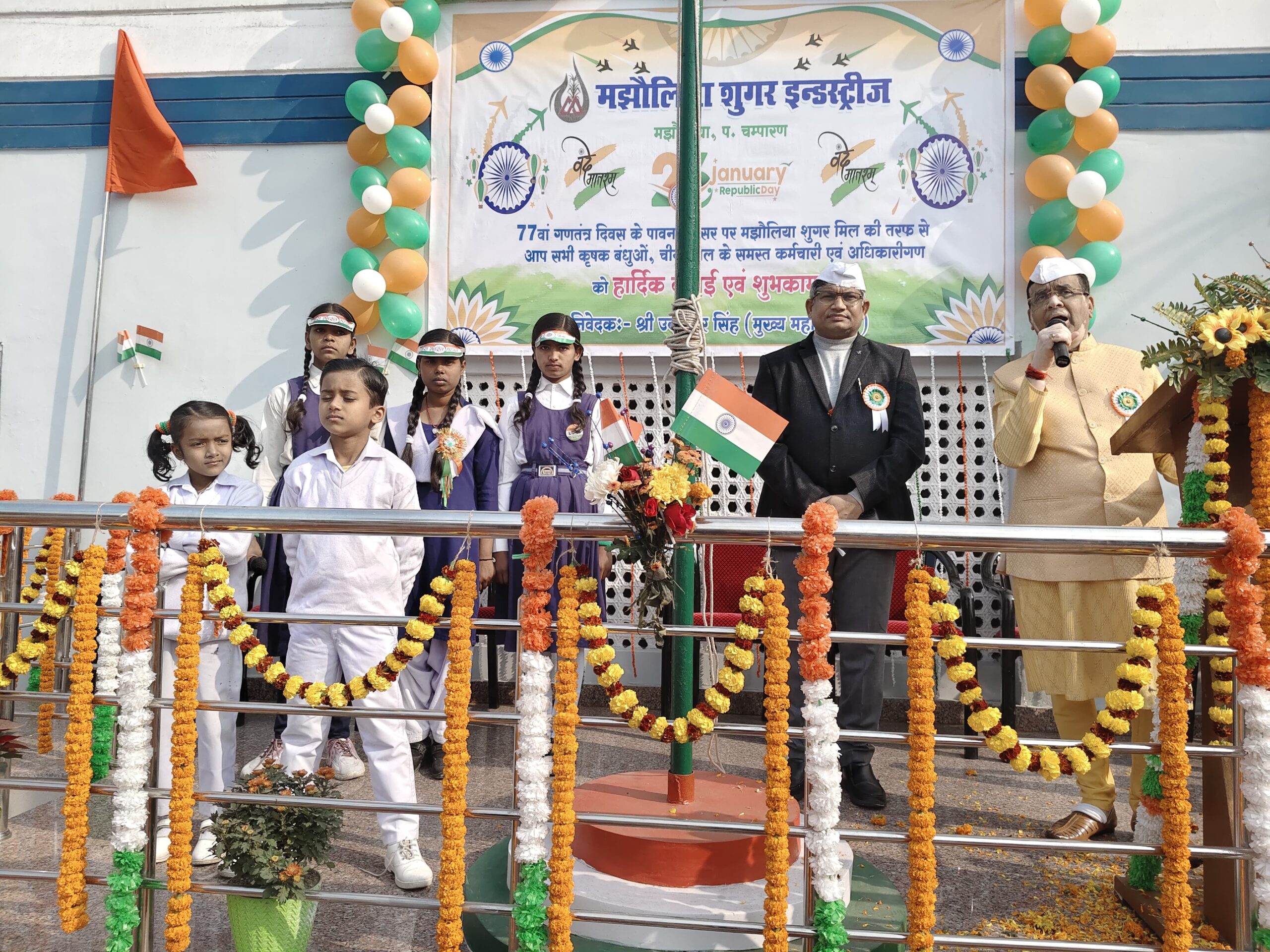 मझौलिया (पश्चिमी चंपारण)।77वें गणतंत्र दिवस के अवसर पर मझौलिया प्रखंड में देशभक्ति और उल्लास का माहौल देखने को मिला। चंपारण जिले की प्रतिष्ठित मझौलिया शुगर इंडस्ट्रीज में इस अवसर पर भव्य समारोह का आयोजन किया गया, जहां कोलकाता से पधारे बिड़ला ग्रुप के प्रेसिडेंट सह चीफ फाइनेंस ऑफिसर आर. के. गनेरीवाला ने ध्वजारोहण किया और सुरक्षा कर्मियों की परेड की सलामी ली।