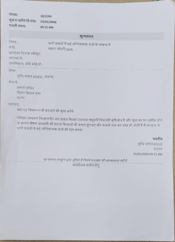 उन्होंने कहा कि यदि इन चारों प्रखंडों में स्थायी रूप से बड़ी दमकल गाड़ियां उपलब्ध कराई जाएं, तो आग लगने की स्थिति में त्वरित कार्रवाई संभव होगी और समय रहते आग पर काबू पाया जा सकेगा। इससे लोगों की जान-माल की सुरक्षा सुनिश्चित होगी और हर साल होने वाले भारी नुकसान को रोका जा सकेगा। विधायक ने राज्य सरकार से मांग करते हुए कहा कि गंडक पार के संवेदनशील क्षेत्रों की भौगोलिक स्थिति को देखते हुए यहां स्थायी अग्निशमन केंद्र स्थापित करना अत्यंत आवश्यक है, ताकि आपदा की स्थिति में तत्काल राहत पहुंचाई जा सके। स्थानीय लोगों ने भी विधायक की इस मांग का समर्थन करते हुए इसे क्षेत्र की सुरक्षा के लिए जरूरी कदम बताया है।