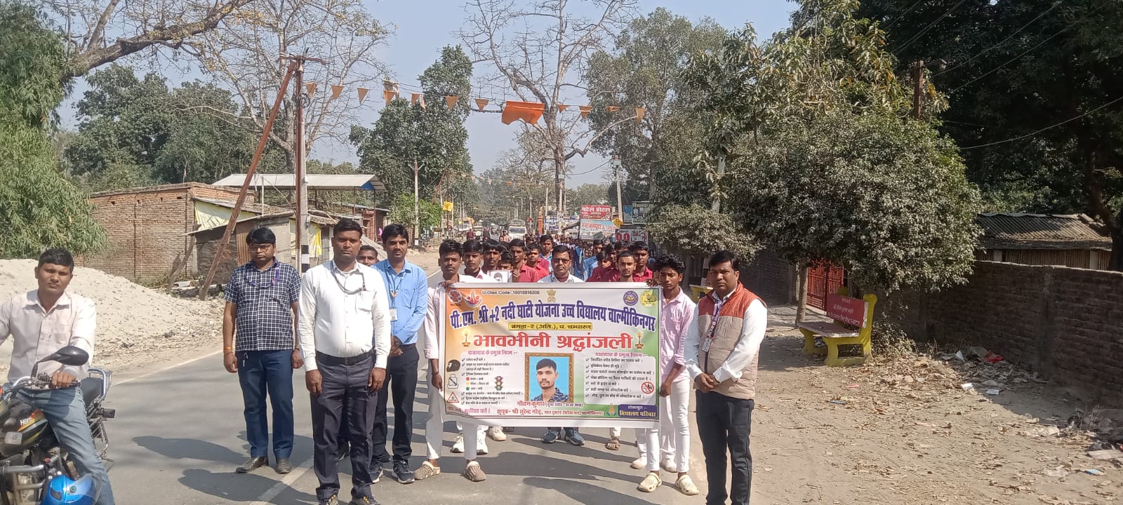 वाल्मीकि नगर स्थित नदी घाटी प्लस टू माध्यमिक विद्यालय के 11वीं के 17 वर्षीय छात्र गौतम कुमार पिता सुरेंद्र शाह के सड़क दुर्घटना में इलाज के दौरान हुई मौत के बाद विद्यालय परिवार का छात्र के प्रति लगाव और प्रेम देखने को मिला। सोमवार की दोपहर प्राचार्य राकेश कुमार राव के नेतृत्व में विद्यालय के लगभग 400 छात्र-छात्राओं ने हाथों में गौतम कुमार अमर रहे, के बैनर के साथ पूरे वाल्मीकिनगर में मौन धारण कर श्रद्धांजलि स्वरुप रैली निकाली। विगत गुरुवार की देर रात दोस्त के बहन की शादी से वापस आने के क्रम में बाइक के अनियंत्रित हो जाने के कारण पेड़ से जोरदार टक्कर हो गई, जिसमें गौतम के साथी महेंद्र मुखिया भी गंभीर रूप से घायल हो गया जो वर्तमान में इलाजरत है। उस घटना में गंभीर रूप से घायल गौतम का इलाज के क्रम में शुक्रवार की देर रात मौत हो गई।