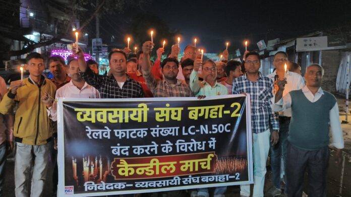 बगहा में रेलवे फाटक बंद किए जाने के निर्णय के विरोध में स्थानीय व्यवसायियों का आक्रोश एक बार फिर सामने आया। अपनी मांगों को शांतिपूर्ण ढंग से रखने के उद्देश्य से आज बड़ी संख्या में व्यवसायियों और स्थानीय लोगों ने कैंडल मार्च निकालकर विरोध प्रदर्शन किया। यह कैंडल मार्च स्टेट बैंक चौराहा से शुरू होकर रेलवे स्टेशन तक निकाला गया। हाथों में मोमबत्तियां लिए प्रतिभागियों ने शांतिपूर्ण तरीके से मार्च करते हुए प्रशासन तक अपनी बात पहुंचाने का प्रयास किया।इस दौरान व्यवसायियों ने कहा कि रेलवे फाटक बंद होने से उनके कारोबार पर प्रतिकूल प्रभाव पड़ेगा। साथ ही आम लोगों को भी आवागमन में भारी परेशानियों का सामना करना पड़ेगा।