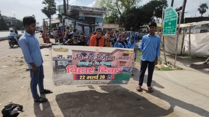 बगहा में बिहार दिवस के अवसर पर बगहा नगर में रा. म. वि. उर्दू अंजुमन, बगहा द्वारा रविवार को भव्य प्रभात फेरी निकाली गई। इस दौरान विद्यालय के छात्र-छात्राओं ने बढ़-चढ़कर हिस्सा लिया और पूरे नगर में जागरूकता का संदेश दिया।