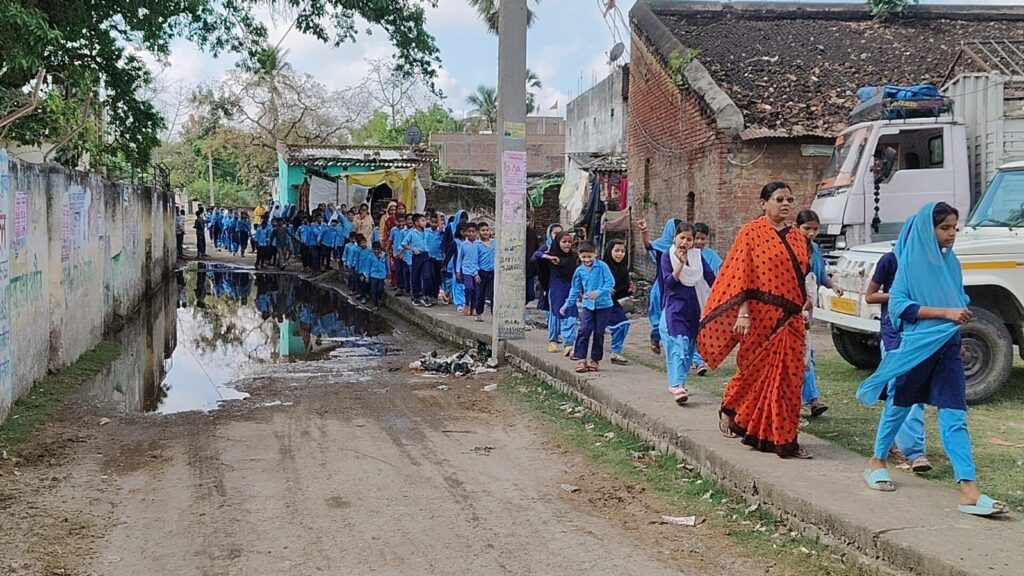 हालांकि शनिवार को हुई बारिश के कारण कई गलियों और रास्तों में जलजमाव की स्थिति बनी रही, और एनएच 727 के सर्विस लेन अतिक्रमित होने के कारण बच्चों को काफी कठिनाइयों का सामना करना पड़ा। जगह-जगह कीचड़ और पानी भरे होने के बावजूद छात्र-छात्राएं सावधानीपूर्वक आगे बढ़ते रहे और उनका उत्साह कम नहीं हुआ।