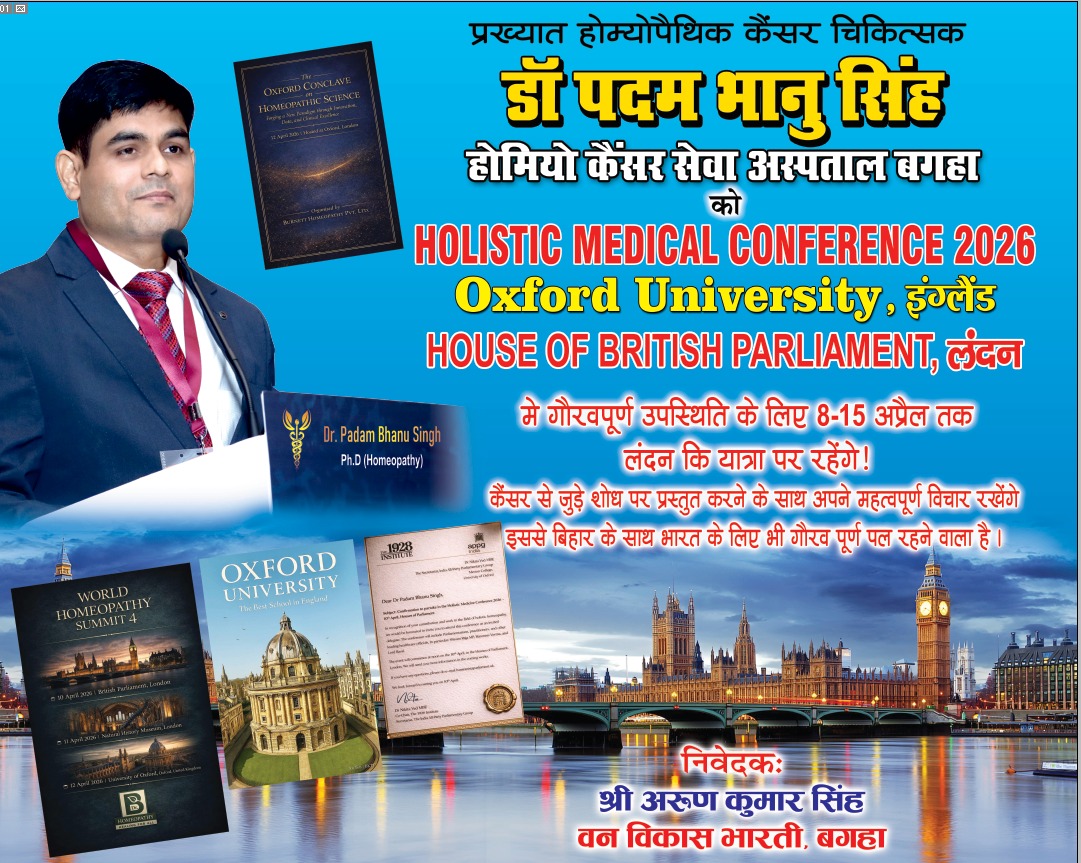 बगहा। बिहार के लिए गर्व का क्षण है कि पश्चिम चंपारण के बगहा स्थित होमिया कैंसर सेवा अस्पताल के प्रख्यात होम्योपैथी चिकित्सक को लंदन में आयोजित अंतरराष्ट्रीय समग्र चिकित्सा सम्मेलन 2026 में विशेष आमंत्रित प्रतिनिधि के रूप में शामिल होने का अवसर मिला है। यह प्रतिष्ठित सम्मेलन 10 अप्रैल को तथा 13 अप्रैल को में आयोजित किया जाएगा, जिसमें विभिन्न देशों के नीति-निर्माता, सांसद, चिकित्सक और स्वास्थ्य विशेषज्ञ भाग लेंगे।