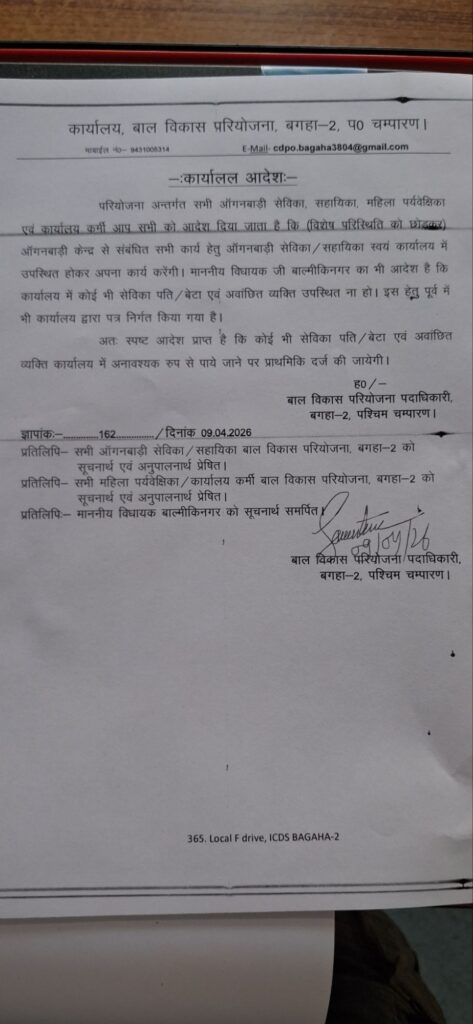बगहा दो बाल विकास परियोजना कार्यालय में अब आंगनवाड़ी से जुड़े सभी कार्यों के लिए सेविका या सहायिका को स्वयं उपस्थित होना अनिवार्य कर दिया गया है। बाल विकास परियोजना पदाधिकारी सावित्री दास ने इस संबंध में स्पष्ट आदेश जारी करते हुए कहा है कि किसी भी कार्यालयीय कार्य में सेविका या सहायिका के स्थान पर उनके पति या बेटे की उपस्थिति स्वीकार नहीं की जाएगी।