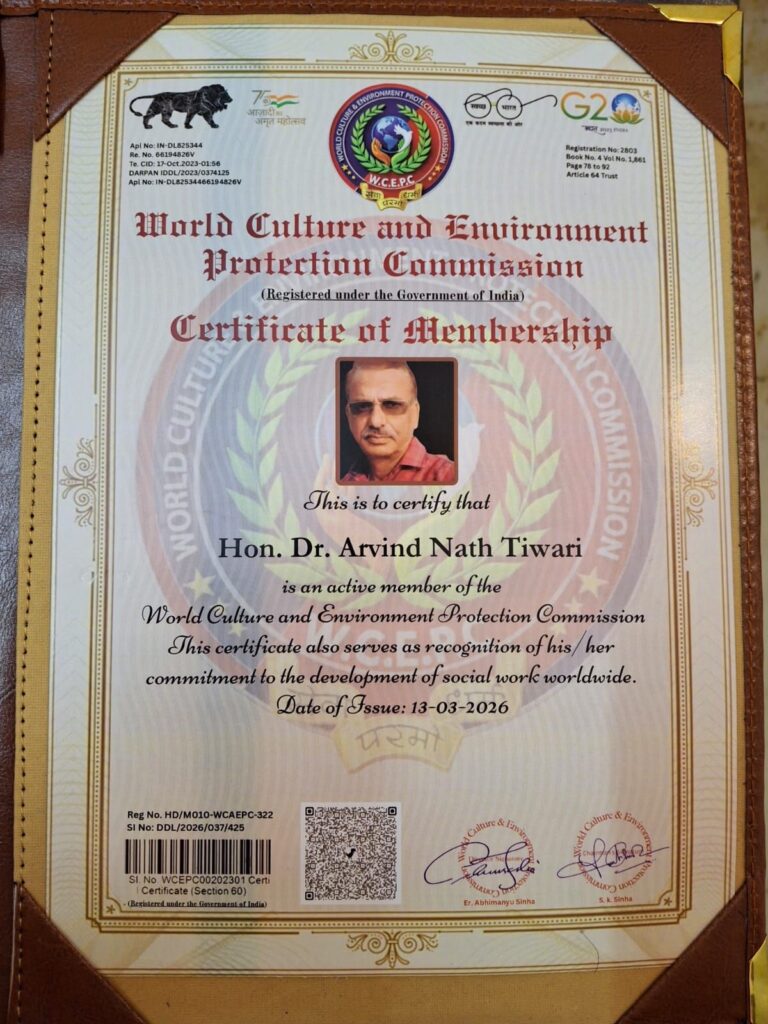 विश्व संस्कृति और पर्यावरण संरक्षण आयोग, नई दिल्ली द्वारा आयोजित कार्यक्रम में प्रो. अरविन्द नाथ तिवारी को डाॅक्टरेट की उपाधि देकर सम्मानित किया गया है, यह आयोजन ग्रीन लांग नार्थ बैंकेंट न्यू देहली अशोक बिहार के सभागार में किया गया।कार्यक्रम में मुख्य अतिथि के तौर पर पधारे फिल्म अभिनेता सुदेश बेरी,विशिष्ट अतिथि राकेश कुमार राही सेवानिवृत एजुकेशन डायरेक्टर पूर्वी दिल्ली, विजय कुमार यादव सेवानिवृत पुलिस कमिश्नर दिल्ली, शिक्षाविद शिवानी कुमारी आदि ने प्रो.तिवारी को डाॅक्टरेट की मानद उपाधि में प्रशस्ति पत्र,मोमेंटो, शाल, मेडल देकर मंच पर सम्मानित किया। डाॅक्टरेट का सम्मान पर्यावरण, साहित्य और पत्रकारिता के क्षेत्र में उत्कृष्ट और प्रशंसनीय कार्य करने के लिए मिला है।